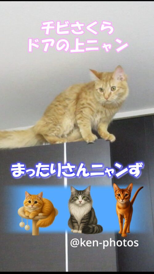 「ドアの上がお気に入りの場所なんだニャ」とでも言いたげに、軽やかにドアの上を歩く猫ちゃん。 まるでキャットウォークを颯爽と歩くモデルさんのようです。 猫って高いところが好きと言いますが、こんなユニークな場所も遊び場になるんですね。 ドアの上から、まったりさんニャンずのお部屋全体を眺めているのでしょうか。 その凛々しい姿に、思わず見入ってしまいます。